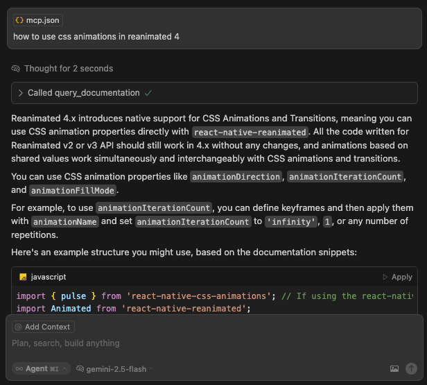 3. Currently (June 2025), the knowledge base used by Radon AI contains only documentation files. While some documentation pages contain code snippets, we do not index the full source code of the libraries. For this reason, the React Native code generated by Radon AI may not be accurate.