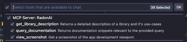 Radon IDE automatically configures and activates Radon AI MCP server for you. Also, VS Code respect the mcp.json config from other editors (e.g. .cursor/mcp.json) and configuration through .vscode/mcp.json.
